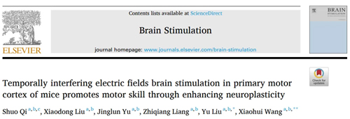 近期,上海体育大学刘宇、王晓慧团队在Brain Stimulation杂志上发表题为Temporally interfering electric fields brain stimulation in primary motor cortex of mice promotes motor skill through enhancing neuroplasticity的文章,揭示了时域干涉(Temporal interference, TI)能提高小鼠运动技能,且TI刺激提升运动技能的作用比阳性对照传统的经颅交流电流刺激(transcranial alternating current stimulation, tACS)更优。